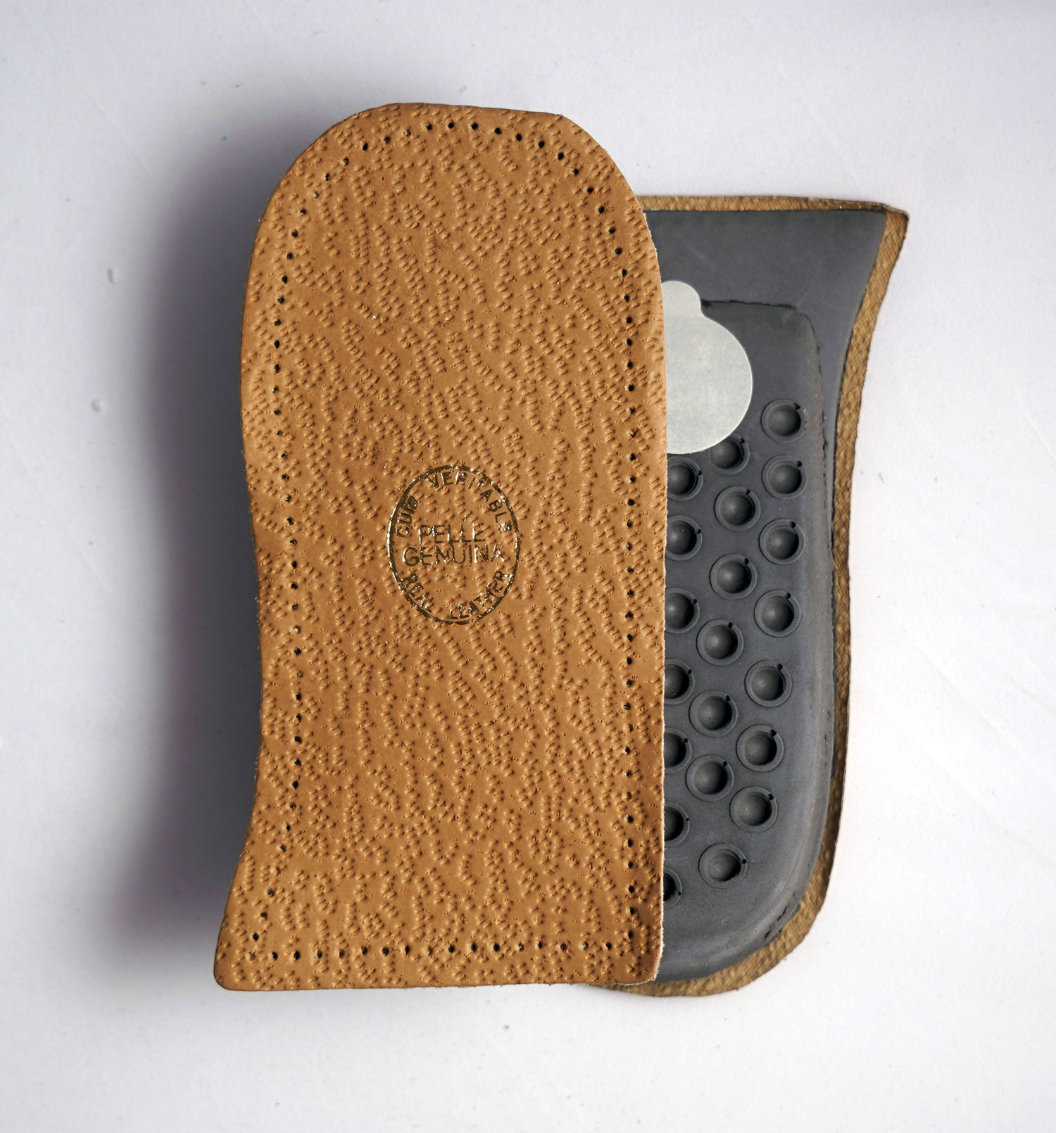 Υποστήριγμα φτέρνας. Στο επάνω μέρος φυσικό δέρμα και από κάτω σκληρό λατέξ με μακρύ σχήμα, ώστε να δίνει περισσότερο ύψος προσφέροντας την απαραίτητη άνεση.